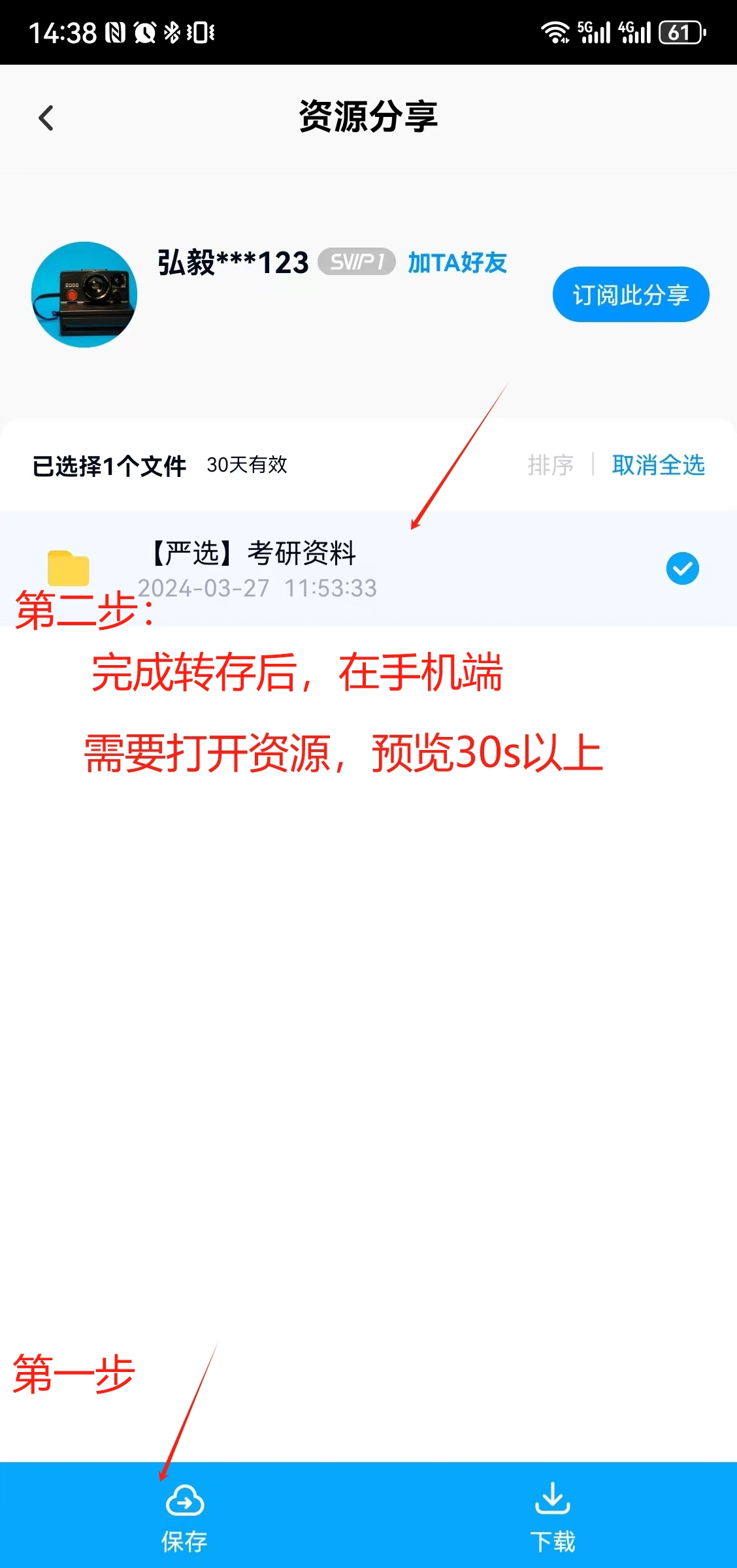 用户如何根据我提供的网盘链接和口令保存想要的资料呢?请看以下说明,一定要按说明来操作 :